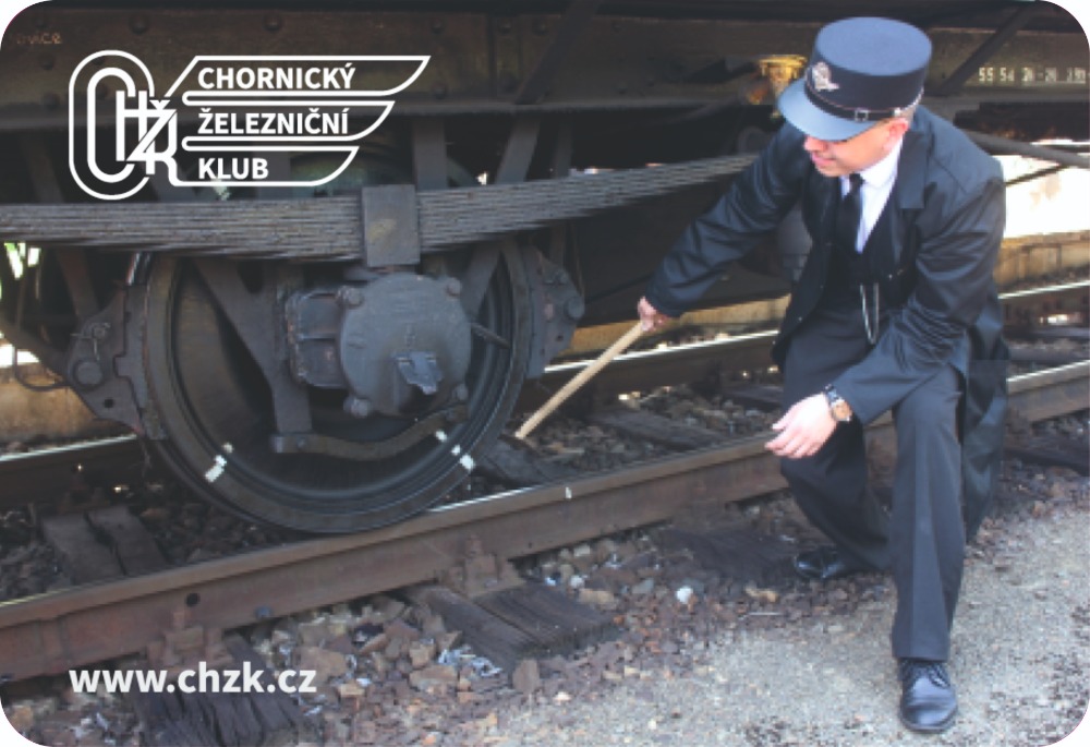 Upomínková magnetka s fotografií vozmistra provádějícího zkoušku brzdy.