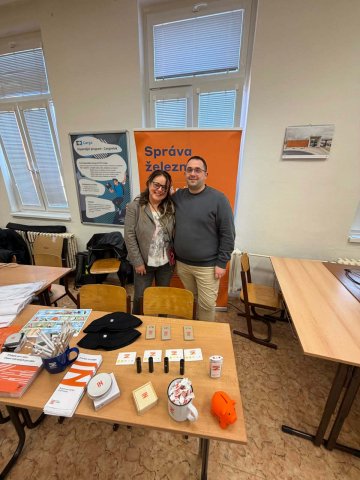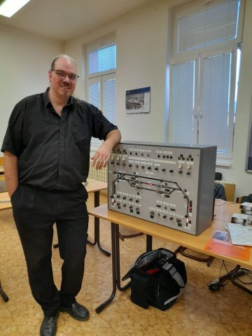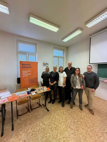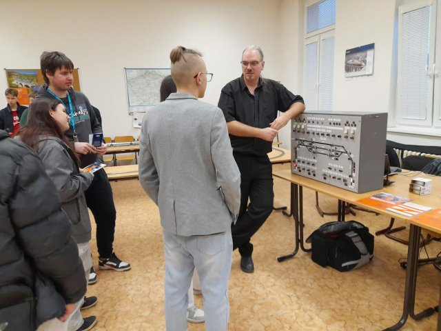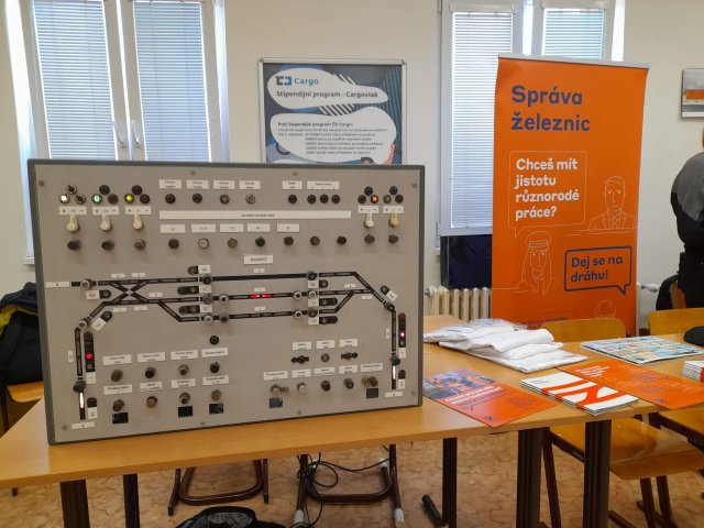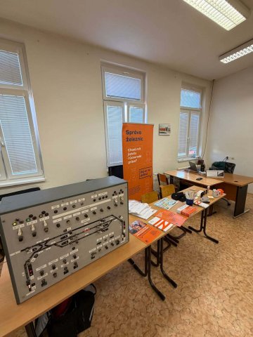 Také tento rok jsme navázali na tradici posledních let a již 22. ledna 2026 jsme se vydali spolu s kolegy ze Správy železnic na VOŠ a SPŠ strojní, stavební a dopravní Děčín na den otevřených dveří. Stejně jako při loňských prezentacích pro Správu železnic jsme s sebou vzali omezenou prezentační sestavu. Prezentovali jsme pouze kolejovou desku stanice Boskovice vybavenou reléovým zabezpečovacím zařízením cestového systému. Simulovaná doprava jezdila pouze po této stanici a při odjezdu na trať ihned přijížděla z druhé strany zpět. Tento model se již loni ukázal být velice výhodný pro prezentace, při kterých nemají návštěvníci na úplný výklad časový prostor. I přes tato omezení bylo možné vysvětlit základní principy fungování zabezpečovací techniky a řízení železničního provozu, a přiblížit tak zájemcům o studium možné uplatnění po skončení studia. Těch se nalezla pěkná řada a někteří z nich po krátkém zaškolení byli schopní naše zařízení obsluhovat zcela samostatně. Děkujeme oblastnímu ředitelství Správy železnic Ústí nad Labem za pozvání a škole nezbývá než přát mnoho nových a do železnice zapálených studentů.