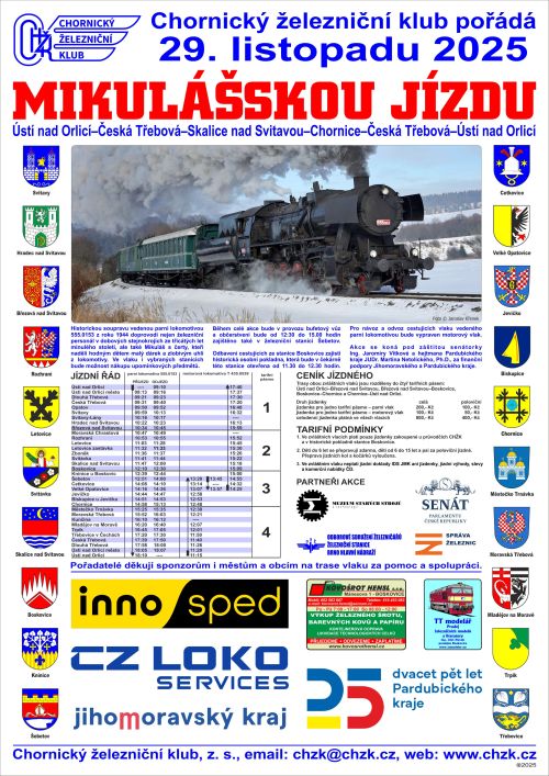 Chornický železniční klub si Vás na sobotu 29. listopadu 2025 dovoluje pozvat na tradiční Mikulášskou jízdu zvláštního vlaku vedeného parní lokomotivou 555.0153 z roku 1944. Jeho soupravu sestavenou z historických vozů doprovodí nejen železniční personál v dobových stejnokrojích ze třicátých let minulého století, ale také Mikuláš s čertem, kteří nadělí hodným dětem malý dárek a zlobivým uhlí z lokomotivy. Ve stanicích Boskovice a Šebetov bude možnost získat otisky několika pamětních razítek a speciální pamětní razítko Mikulášské jízdy CHŽK bude k dispozici také ve vlaku vedeném parní lokomotivou. Sběratele jistě potěší možnost nákupu upomínkových předmětů se železniční tematikou. Během celé akce bude v provozu bufetový vůz zařazený v soupravě zvláštního vlaku vedeného parní lokomotivou, kterému v době od 12:30 do 15:00 hodin vypomůže s nasycením návštěvníků akce i speciální občerstvovací stanice Šebetov. Cestujícím ze stanice Boskovice prodá jízdenky historická osobní pokladna, která otevře v čekárně této stanice v 11:30 hodin a zavře až v čase odjezdu zvláštního vlaku vedeného parní lokomotivou. Ten pojede po okružní trase z Ústí nad Orlicí přes Českou Třebovou, Svitavy, Letovice, Skalici nad Svitavou, Boskovice, Chornice, Moravskou Třebovou, Mladějov na Moravě, Českou Třebovou a svoji 147 kilometrů dlouhou jízdu ukončí v Ústí nad Orlicí. Tato akce se bude moci uskutečnit jen díky darům obcí a měst na trase zvláštního vlaku, Pardubického kraje, Jihomoravského kraje i podpoře sponzorů a partnerů. Všem donátorům velmi děkujeme. Pro návoz a odvoz účastníků akce v úseku Boskovice–Chornice, tedy v trati bez pravidelné osobní železniční dopravy, bude v trase Česká Třebová–Chornice–Skalice nad Svitavou–Česká Třebová vypraven zvláštní motorový vlak, vedený historickou motorovou lokomotivou T 435.0539.