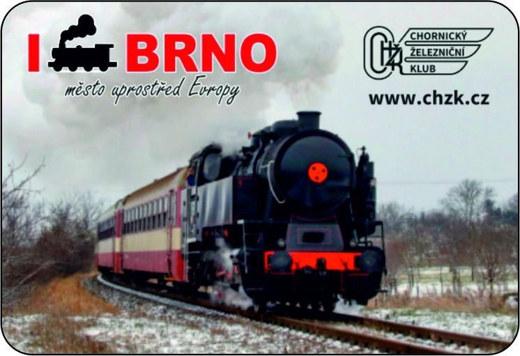 Příležitostná magnetka akce BMUE s fotografií parní lokomotivy 525.101 se zvláštním vlekm u zastávky Vnorovy.